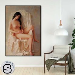 Bức Tranh Cô Gái Treo Tường 57 có hình ảnh một cô gái tóc đen ngồi khỏa thân trên ghế lót vải lụa màu trắng. Mẫu tranh này mang đến vẻ đẹp thẩm mỹ sang trọng, hiện đại và nét nghệ thuật độc đáo cho không gian trang trí.