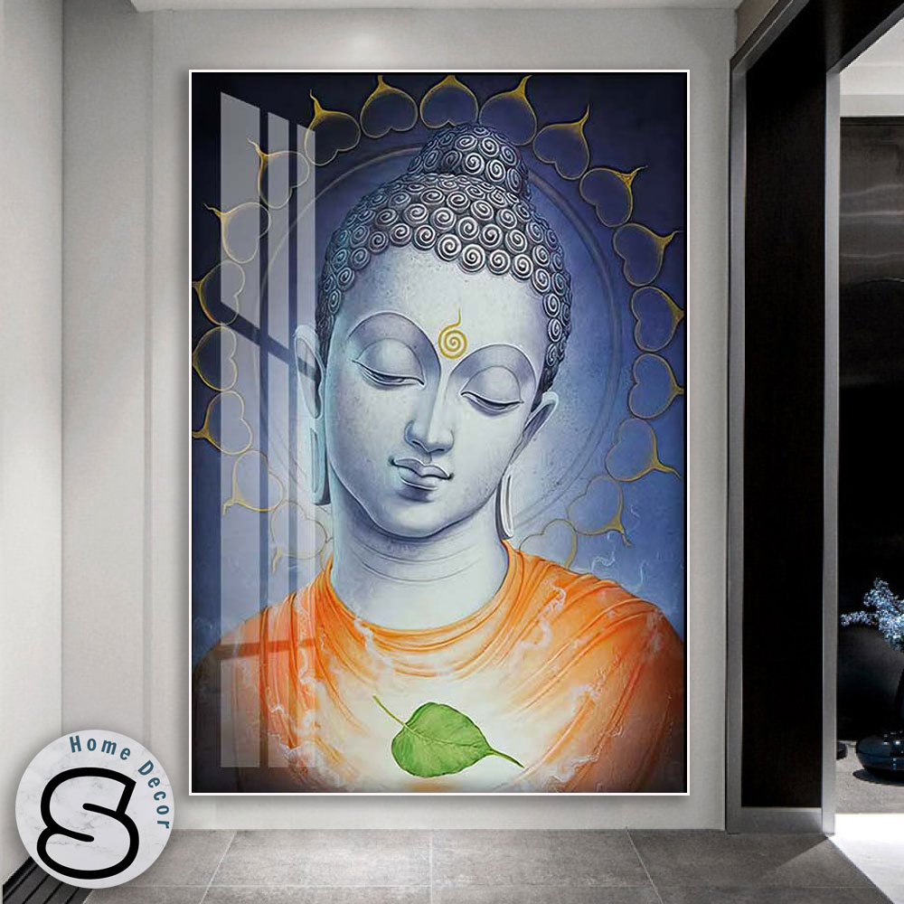 Bức Tranh Treo Tường Phật Giáo 01 có hình ảnh một vị Phật trong xiêm y màu cam với huệ nhãn trên trán. Xung quanh đầu Ngài có một vòng tròn được vẽ cách điệu bằng lá bồ đề mà vàng. Ở dưới cùng của tranh có một chiếc lá bồ đề màu xanh tượng trưng cho trí tuệ và từ bi của Ngài. Mẫu tranh Phật này mang đến năng lượng bình an và phong thuỷ tốt lành cho không gian trang trí.